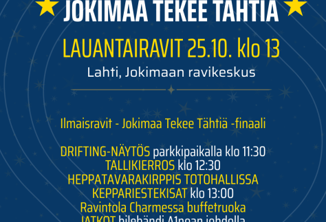 Jokimaa Tekee Tähtiä 25.10.2025 Tapahtumat 20. - 22.10.2025 10:00 - 15:00 Lasten kepparileiri 25.10.2025 13:00 - 18:00 Jokimaa Tekee Tähtiä -Ravit Jokimaan RavikeskusJokimaankatu 6, 15700 Lahti 30.10.2025 12:00 - 20:00 Sänkisäpinät 01. - 02.11.2025 10:00 - 18:00 Kivi- ja korumessut 09.11.2025 13:00 - 18:00 Isänpäivän ilmaisravit Jokimaan RavikeskusJokimaankatu 6, 15700 Lahti 22. - 23.11.2025 21:00 - 04:00 Winter Wonderland – Erotic Rave › Mene tapahtumakalenteriin Ajankohtaista jokimaa tekee tähtiä & hevosenomistajapokaali – näiltä radoilta finaaliin seuraavat HARJOITUSRAVIT sunnuntaina 23.11. KLO 12 Tie Suur-Hollolaan – syksy 2025 – lopulliset pisteet ILMAISRAVIT Torstaina 9.10. KLO 18 – KÄSIOHJELMA ILMESTYNYT harjoitusravit ti 7.10. klo 18 – OSALLISTUJAT & TULOKSET jokimaa tekee tähtiä 2025 – 2. erän jälkeen mukana olevat hevoset › Lue lisää ajankohtaisia Info & saapuminen Ruoka & juoma Vuokraa tiloja Osta lippu Facebook Twitter Instagram Youtube Tiktok
