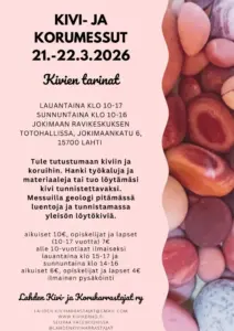 Kivimessut 2026 Kivien tarinat järjestetään Jokimaan ravikeskuksessa, totohallissa 21.-22.3.2026. Messut avoinna lauantaina klo 10 – 17 ja sunnuntaina klo 10 – 16. Geologi paikalla tunnistamassa yleisön kiviä ja pitämässä luentoja.