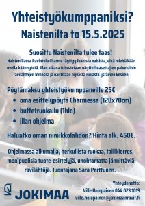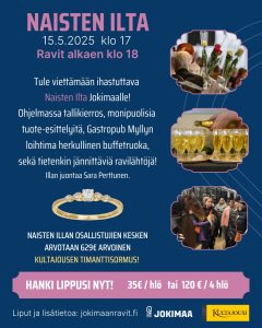 Tule viettämään ihastuttava Naisten Ilta Jokimaalle! Luvassa on hersyvää yhdessäoloa, viihdyttävää ohjelmaa monipuolisten näytteilleasettajien toimesta, kuten esimerkiksi Wahlsténin ja Hööksin muotinäytös, helliviä hoitoja, sekä arvonta, jonka pääpalkintona on Kultajousen lahjoittama 629€ arvoinen timanttisormus. Eikä tässä todellakaan vielä kaikki! Kultajousi Mimosa-drinkkien ostaneiden kesken arvotaan aito timantti