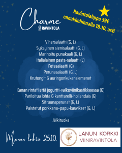 Ravintola Charmessa herkullinen Lanun Korkin loihtima buffetruoka ennakkohintaan 39€ (norm. 45€). Ennakkohinta voimassa 18.10. asti.