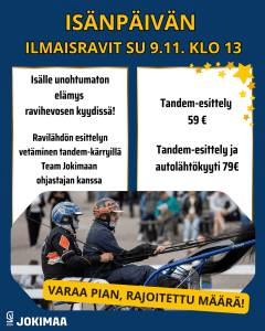 Isänpäivänä on mahdollista päästä kokemaan vauhdin huumaa ravien aikana ravihevosen kyydissä lähdön esittelyssä ja myös startissa lähtöauton kyydissä. Varaa tandem-esittely tai molemmat elämykset alla olevasta linkistä. Elämyksiä tarjolla rajoitettu määrä – varaa pian!