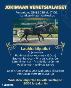 Tule kokemaan vauhdin hurmaa ja tunnelmaa, kun Jokimaan rata täyttyy kavioiden kopseesta ja yleisön jännityksestä – ravikilpailujen lisäksi luvassa näyttävät laukkalähdöt poneilla, suomenhevosilla ja puoliverisillä hevosilla.